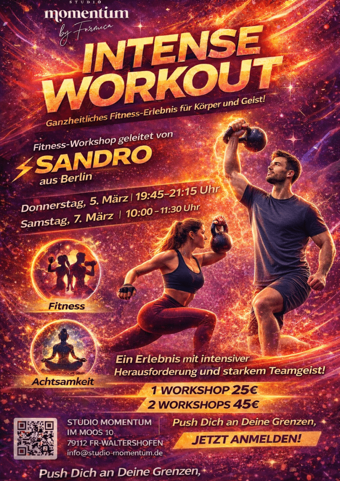 Lass dich von mitreißender Musik und einem wunderschönen Ausblick auf den Tuniberg inspirieren und kreiere deinen eigenen unvergesslichen Moment! Im Studio Momentum in Freiburg Waltershofen bist du herzlich willkommen.