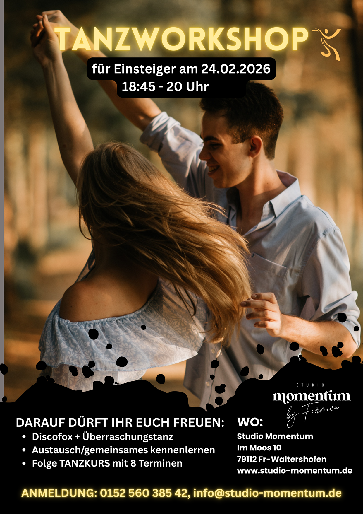 Hast du Freude am Tanzen? Herzlich willkommen bei Christina und Franco Formica! Auf unserer Tanzfläche wirst du unvergessliche Momente erleben – wir freuen uns, dich in Freiburg Waltershofen im Studio Momentum begrüßen zu dürfen!
